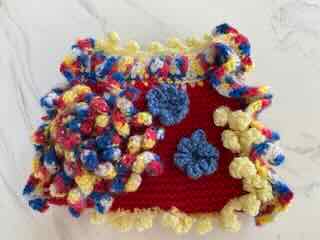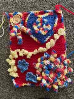 I have added 5 extra rows to the top and bottom to fit comfortably around the wrist. One row has bobbles. I joined these two ends together and finished off by adding a twirl every three stitches. The sides have a coral reef edging. Done! And no time recorded.