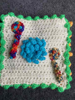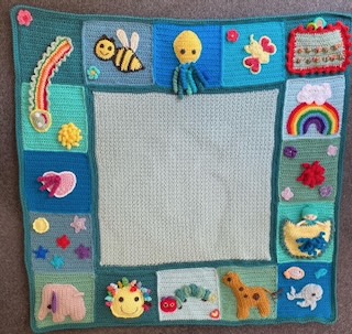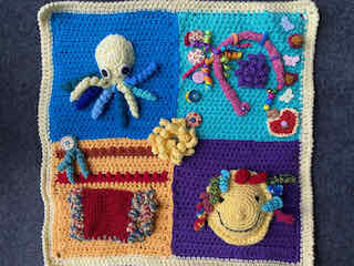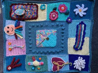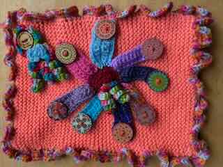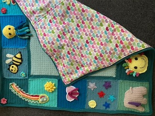A play blanket I made for my youngest granddaughter illustrates what various small mats can look like. These are all joined to create interest and sensory play for a baby. And this large play blanket is lined with material.