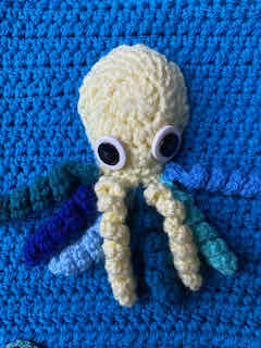 The octopus is ideal to put on a twiddle mat, cuff or muff. Just make half the head and stuff it as you attach it to the twiddle mat.